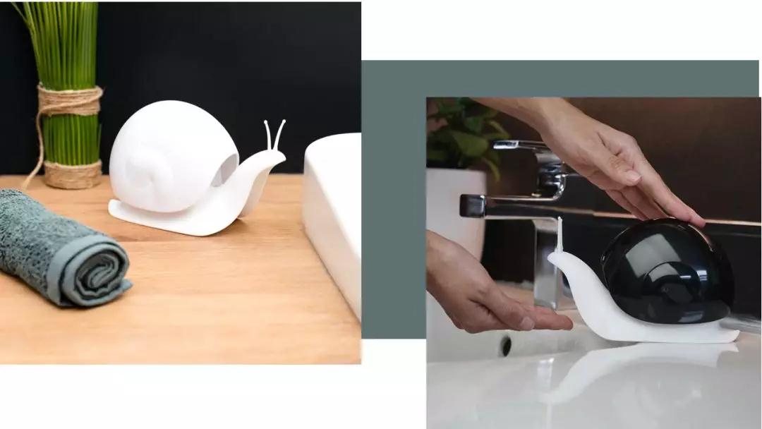 其实是皂液瓶啦,用来装洗手液,按一按蜗牛的壳,洗手液就会从它嘴里流出来。