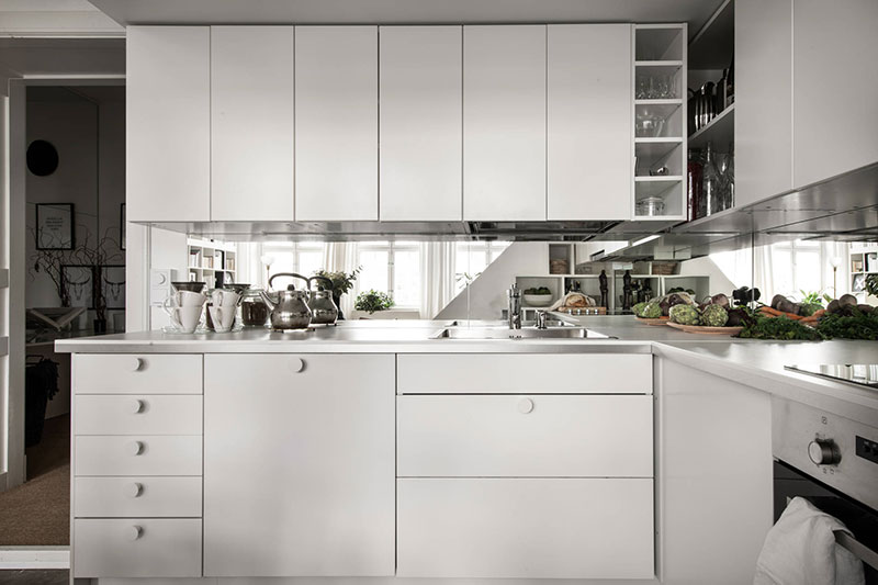 厨柜的白色板材,自然延伸至天花板,浑然一体,奠定简洁统一的白色厨房色调,中部的细黑墙砖防溅区域是真心好看!