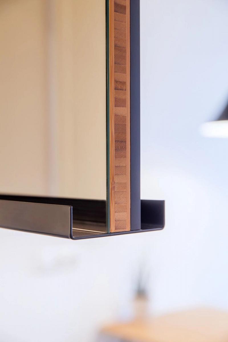 厨房背后是淋浴房,水槽上方蓝色隔板,靠卫生间一侧是化妆镜,摇身一变就成了洗漱台。