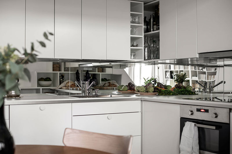 厨柜的白色板材,自然延伸至天花板,浑然一体,奠定简洁统一的白色厨房色调,中部的细黑墙砖防溅区域是真心好看!